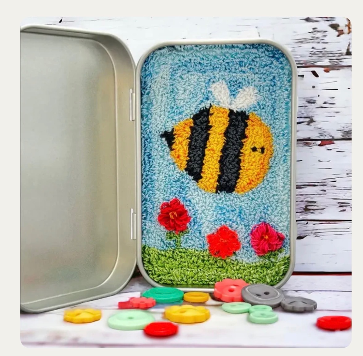 This sweet little punch needle project fits inside a small tin that can be used for your sewing notions or any of your small keepsakes. New to punch needle? No problem. In this class you will learn everything that you need to create this sweet project. We will also review finishing techniques for your punch needle project. Class fee includes a bonus pattern for a small “bee” needle keep to make for your tin.